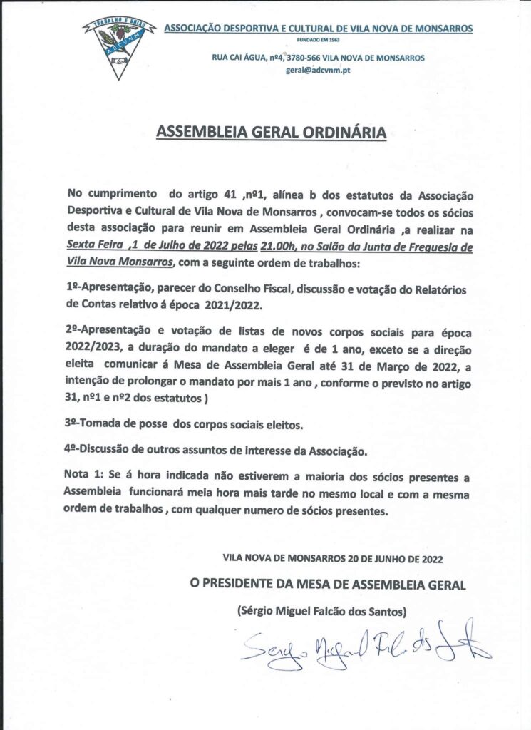 A Associação Desportiva e Cultural de Vila Nova de Monsarros convoca os seus sócios para uma Assembleia Geral Ordinária com a seguinte ordem de trabalhos:
